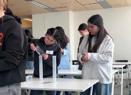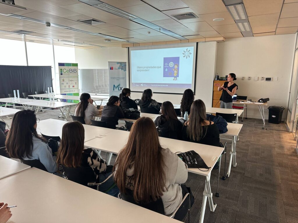 Durante la jornada del sábado 4 de octubre, el equipo del Núcleo realizó en la Facultad de Ciencias Físicas y Matemáticas (FCFM) de la Universidad de Chile el taller “Nanopropiedades de los materiales”, a cargo de la investigadora Adriana Blanco, donde las y los asistentes pudieron descubrir cómo cambian las propiedades de la materia al trabajar a escala nanométrica. La actividad incluyó además una visita guiada al laboratorio de Tribología y Nanomateriales 2D, en el cuarto piso del edificio del Departamento de Ingeniería Química, Biotecnología y Materiales (DIQBM), dirigida por Iasi Cervantes, quien presentó el trabajo experimental que desarrolla el Núcleo en torno al estudio de los MXenos y sus aplicaciones en tribología, catálisis y sensores de gas.